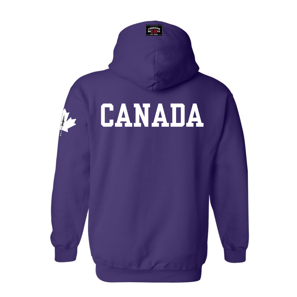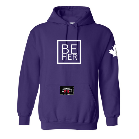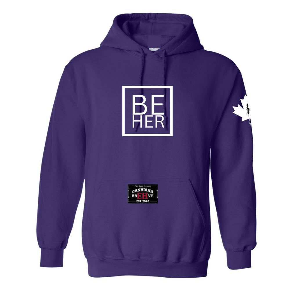 BE HER is heat transferred onto the chest, a checkered MAPLE LEAF on the shoulder and CANADIAN BREHVE on the hood.