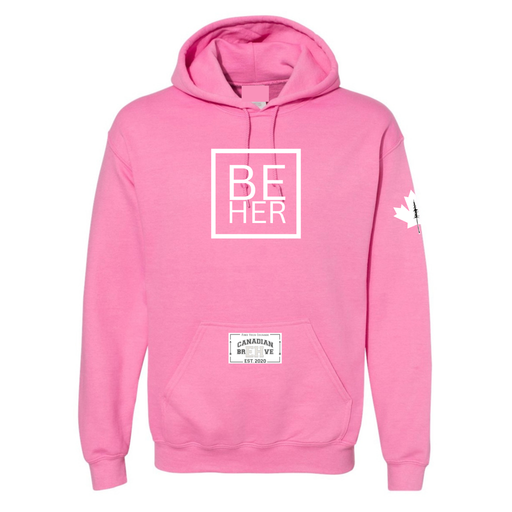 BE HER is heat transferred onto the chest, a checkered MAPLE LEAF on the shoulder, CANADIAN BREHVE on the hood.