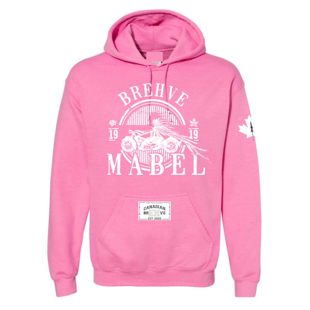 BREHVE MABEL emblem is heat transferred onto the chest. CANADIAN BREHVE is pressed onto the hood and hoodie pocket. The Maple Leaf is pressed to the shoulder.