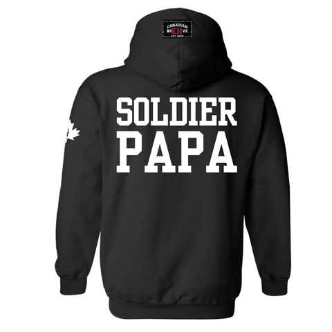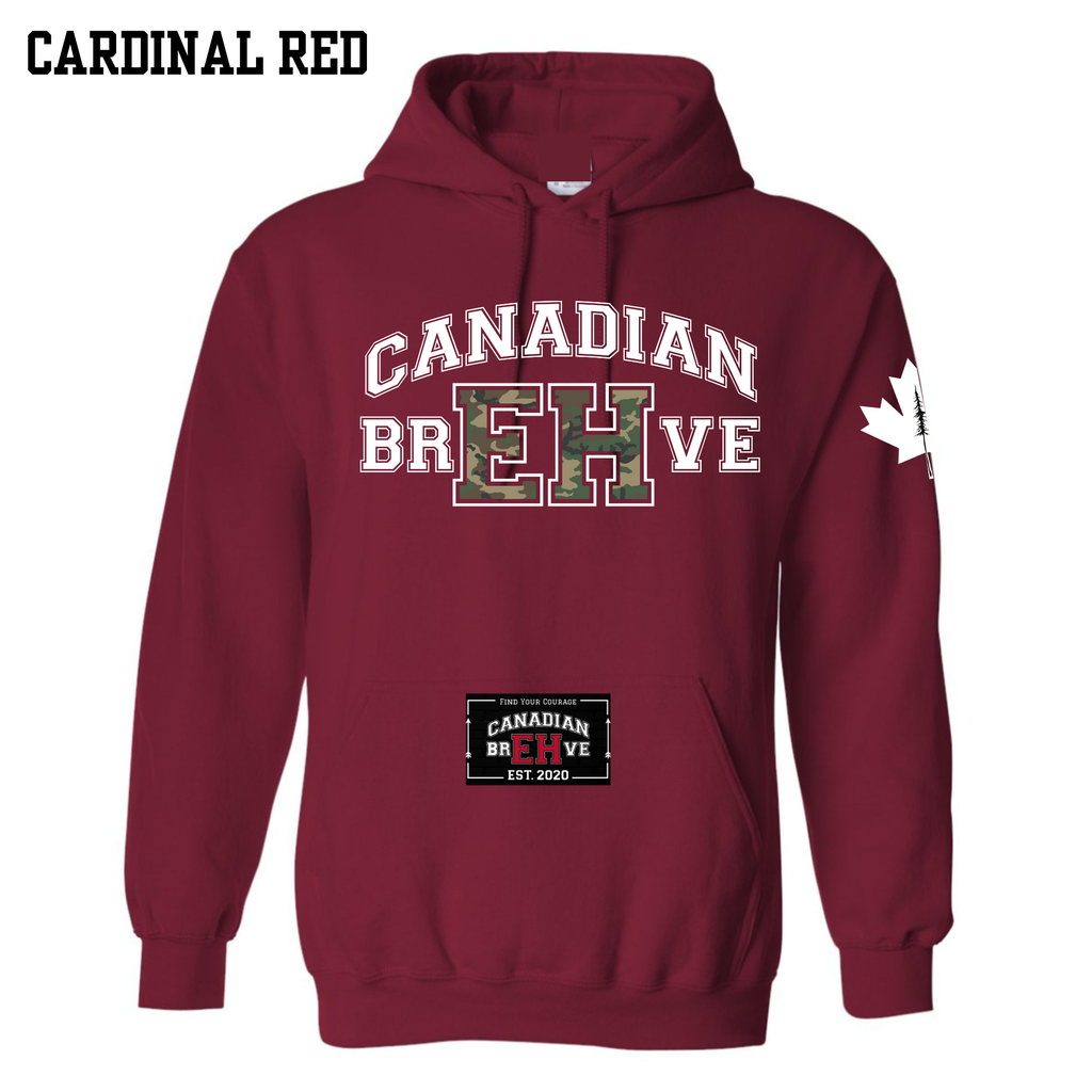 CANADIAN BREHVE CAMO is heat transferred on to the front of the hoodie. The Maple Leaf is pressed onto the shoulder, and CANADIAN BREHVE to the hood and hoodie pocket. Family options are also available.