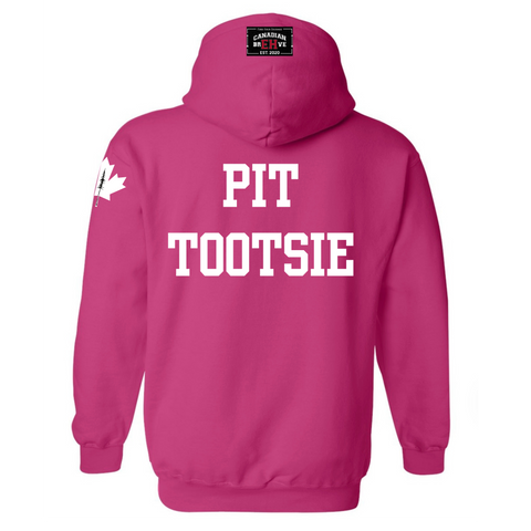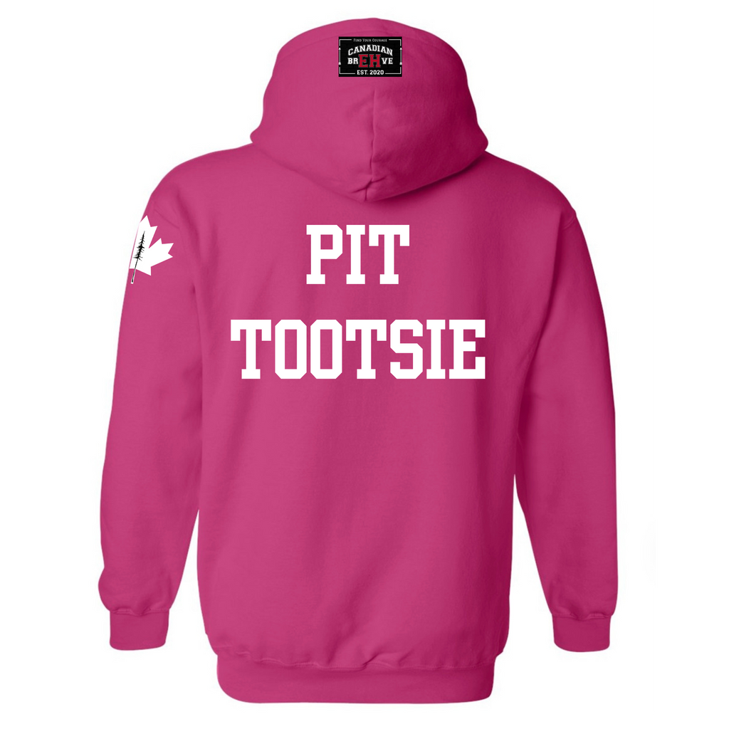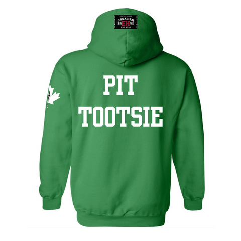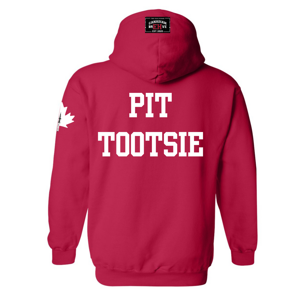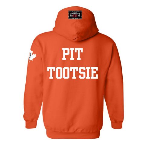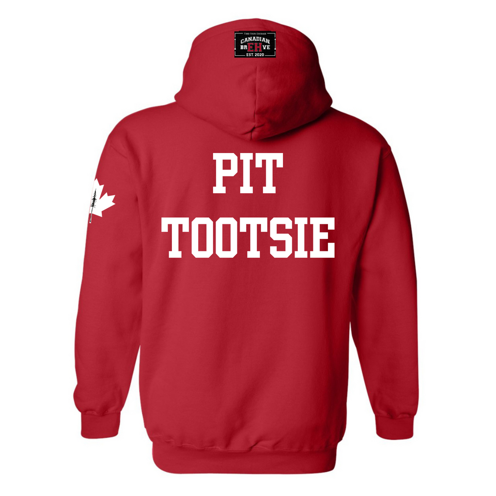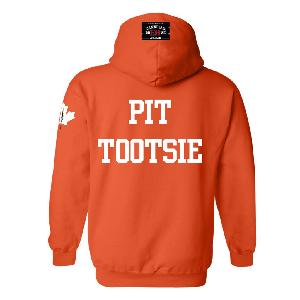 FKN EH is heat pressed across the chest. FKN is embedded into the EH. CANADIAN BREHVE is pressed to the hoodie and front pouch, Maple Leaf to the sleeve. PIT TOOTSIE on the back.